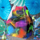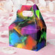 Un abstracto de ensueño en tonos vivos de amarillo, verde, rosa, púrpura, azul, turquesa, naranja, negro y más adornan estas divertidas cajas de favores.