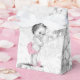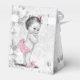 Cajas de favores de baby shower vintage para niñas. Cambia el color del lazo y agrega texto a esta caja de favores de baby shower rosa y negro.