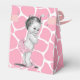 Cajonera pequeña pequeña pequeña jirafa rosa pequeña caja de bienvenida. Puedes añadir texto, cambiar el color del arco y añadir texto a esta caja de favores de ducha de bebé rosa y negro.