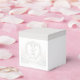 Cajas de favores de boda personalizadas con un elegante diseño de cisne. Texto personalizado en la parte delantera y trasera. Gran embalaje fiesta mostrado en plata oscura. Utilice la plantilla para crear sus propios cuadros de favores de boda personalizados.