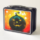 Esta caja de almuerzo tiene una calabaza retratada en ella.