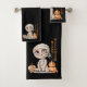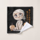 Toalla de baño negra de la percha de calabaza Set Una momia de ojos anchos envuelta en vendas blancas suaves se sienta suavemente en el suelo, la cabeza inclinada con encanto silencioso. El personaje está parado en dos calabazas talladas (una apilada en un diseño de doble nivel) junto a un cráneo diminuto y hojas de otoño dispersas. La paleta muda y el estilo suntuoso mezclan las travesuras de Halloween con la calidez de la estación, que capturan un momento de calma y dulzura espeluznante en un ambiente acogedor de otoño.