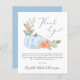 Una tarjeta de agradecimiento económica para tu fiesta de ducha de bebé con "Gracias" en un elegante guión gris con un toque de corazón, y un ramo de acuarela de calabaza azul pastel, flores naranjas y vegetación. Personaliza tu mensaje de agradecimiento en una simple tipografía gris claro y moderna y agrega tus nombres en un guión gris característico.
