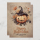 Carta feliz de Halloween con una calabaza espeluznante usando un gorra negro y rodeada de flores frente a una gran telaraña. Personaliza fácilmente esta tarjeta de Halloween con tu nombre y texto familiar.