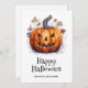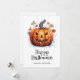 Tarjeta acuarela de Halloween con calabaza espeluznante y hojas de otoño. Personaliza fácilmente esta minimalista tarjeta de Halloween con tu nombre y texto familiar.