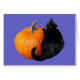 Un gato negro abraza a una gran calabaza naranja en esta divertida tarjeta de Halloween.