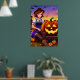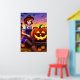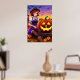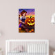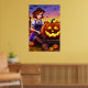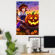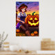Una joven con el pelo corto, en su mayoría de color púrpura, y un gorra en la cabeza con calabaza y sonrisas espeluznantes a su lado. Este es un arte generado por IA. Arte temático de Halloween
