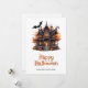 Tarjeta de Halloween con una casa embrujada, calabazas, murciélagos y un fantasma esqueleto con una linterna de jack o'lantern. Personalice fácilmente esta tarjeta acuarela de Halloween con su nombre y texto familiar.