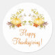 Estos elegantes pegatinas del Día de Acción de Gracias tienen calabazas naranjas y hojas de otoño contra un fondo blanco, y las palabras ¡Feliz Día de Acción de Gracias!