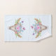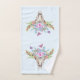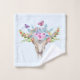 Toalla de baño con un fondo color turquesa y agua pastel. Un cráneo boho de animales de moda con un ramo de flores en la cabeza y pequeñas mariposas revoloteando por ahí.
