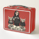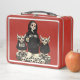 Pack your lunch with a dah street style! This eye-catching lunch box features the Naughty Coo Crew - a skeleton gang sporting hoodies and attitude, flanked by her mischievous cow sidekicks. Set against a bold red background with skulls scattered at their feet, this design blends Day of the Dead aesthetics with urban edge. Perfect for those who like their lunch break served with a side of rebellion. Durable metal construction with secure latch keeps your food fresh while you keep it real.