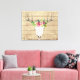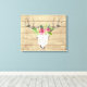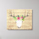 Boho acuarela / calavera tribal con cuernos a rayas y ramo de flores tropicales en el fondo de un panel de madera