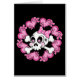 Calavera gruesa y huesos cruzados con polka salpicados de arco rodeado de corazones y flores rosas.