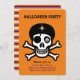 Halloween espeluznante calavera sobre la invitación a la fiesta de fondo naranja. Todos los textos y números están listos para ser personalizados.