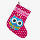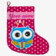 Pequeño búho lindo que sostiene el regalo del navidad disponible. Usted puede personalizar con su nombre o cambiar color de fondo