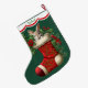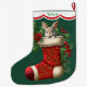 Este caldo de leña tiene la imagen de un adorable conejo de conejo bebé que asoma a una represa roja ornamentada. La imagen está rodeada de bayas rojas, flores de tiburón y flores de poinsettia, y se coloca sobre un fondo verde Navidad. Un diseño de borde blanco de vieiras bordeado por rojo sostiene tu nombre personalizado en la parte superior. La parte posterior de la media de carga es idéntica a la parte delantera.