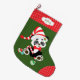 Un oso panda blanco y negro adorable lleva puesto un gorro rojo y blanco y sostiene un bastón de caramelo en la parte delantera de este caldo colorido y luminoso. Unas cuantas bombillas de árbol rojas, azules y verdes están dispersas por el oso. Lleva una corbata roja de polikadot, que coincide con el pie y el borde superior. En el borde superior hay una etiqueta blanca con el texto personalizado en verde, que coincide con el color de fondo. La parte posterior de la media tiene el mismo patrón de polkadot. ¡Genial para un niño o chica!