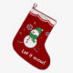 Un muñeco de nieve del dibujo animado se vistió en soportes verdes del casquillo y de la bufanda de media en medio de los copos de nieve azules claros bonitos en esta media linda. ¡La parte inferior de la media dice en blanco brillante lo dejó nevar! Las imágenes y el texto se ponen en un fondo brillante del rojo del día de fiesta. El su nombre o el otro texto de encargo está en verde en el borde superior blanco horneado a la crema y con pan rallado que se confina en rojo y blanco.