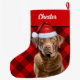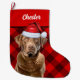 Tonos de rojo en una gran manta de búfalo que crea un dulce Navidad de relleno con un ilustracion acuarela de vacaciones listas, perro de Chesapeake Bay Retriever y el nombre de tu cachorro en ambos lados.