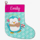 This happy little penguin is the featured star, is this design. He's ready for the winter season with his striped scarf, pink earmuffs. The blue-green background has an overlay of white snowflakes.