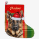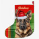 A festive holiday Christmas stocking has a watercolor illustration of a cute German Shepherd wearing a snazzy Santa hat on a festive red and green plaid, with your pup's name on both sides.