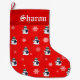 Pequeños hombres de nieve con fondo rojo y copos de nieve alrededor. La parte superior de la media es el rojo sólido y lo personalizas con tu nombre.