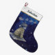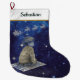 A sweet and magical Christmas stocking featuring a young boy gazing at Santa’s sleigh across a sparkling night sky. Perfect for children who still believe in Christmas magic. The gentle navy and silver tones make it a timeless keepsake for years to come.