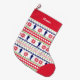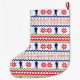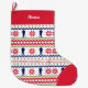 The repeated pattern on this colorful Christmas Nordic sweater style Holiday stocking is a silhouette baseball player leaning on his bat among snowflakes, trees, and geometric designs. Colors include navy blue, bright Holiday green, and red, all on a white background. A matching red top border holds her name in white script, and there's a toe patch, too. Fun for anyone who loves baseball!