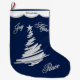 Un árbol de navidad de plata estilístico bonito es la característica en el frente de este almacenamiento del navidad. El estilo moderno, árbol impresionista se remata con una estrella de plata, con las palabras de la escritura en plata que dicen "alegría", "esperanza", y "paz" al lado de ella. El su nombre o el otro texto de encargo está en azul en el borde superior blanco horneado a la crema y con pan rallado que se bordea con una frontera gris. La parte posterior de la media tiene la misma frontera, el nombre, y una imagen de la campana de plata. Todo se pone en un fondo azul marino.