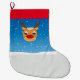 Cara sonriente de reno sobre diseño de fondo de nevada azul.