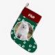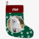 Festividad Mascota de Perro Cuto Foto Pequeños Navidades rebosando con patrón de huellas de perros en fondo rojo y verde. Personalízalo con el nombre de su mascota y la foto de su mascota.