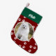 Festividad Mascota de Perro Cuto Foto Pequeños Navidades rebosando con patrón de huellas de perros en fondo rojo y verde. Personalízalo con el nombre de su mascota y la foto de su mascota.