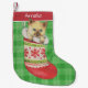 Adorable illustration of a kitten in a festive red and white stocking with a bright green plaid background. Cute stocking to personalise for cat lovers.