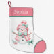 Este bonito diseño de un muñeco de nieve o una dama de nieve está vestido con un vestido de gingham blanco y rosa bonito y un gorra con un arco de gingham verde y blanco. En la parte superior de la reserva se puede personalizar con un nombre. El patrón está en ambos lados de la media y el nombre se puede poner en ambos lados. ¡Es un diseño perfecto para chicas jóvenes o adolescentes!