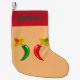 Este formidable Navidad tiene un par de ajíes, un chile rojo y un chile verde. Ambos tienen ojos negros y bocas rosas. Cada chile lleva un gorra con sombrero que tiene un cráneo de color opuesto al ají en celebración del Día de los Muertos en México, Día de los Muertos. El sombrero también contiene tres flores con pétalos rojos y verdes alternados que representan la bandera de México. Hay texto personalizado en la parte delantera para que pueda incluir un nombre.