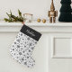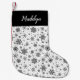 Medias modernas negras y blancas con estilo chic que presentan un patrón de copo de nieve con su nombre o monograma en la parte superior en letras de escritura en caligrafía blanca.