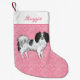 El original ilustracion personalizado de Destei de un perro de raza falène de color blanco y negro sobre un color de fondo rosado con un patrón de corazones de diferentes tamaños. También hay un área de texto personalizable para un nombre.