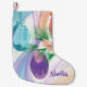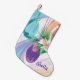 Pretty painting of three Christmas balls, with a placeholder for a name, etc., is printed on the front of this personalized Christmas stocking. The Christmas balls are painted in a paint pour type design with a spray of a pine needle branch on the side. The colors in the design are shades of turquoise and teal, orange, purple, and pink. Thank you for shopping at CherylsArt on Zazzle.