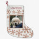 Crea tus propios Navidades de fotos personalizados cargando para los niños o tus mascotas con este divertido diseño de plantillas de copos de nieve de rosa dorado. Añada la foto de su hijo, gato o perro al borde falso del marco del purpurina de oro rosa en el centro de la represa. En la parte superior, los falsos copos de nieve de purpurina dorado rosa permiten un texto personalizado para que puedas añadir un nombre en un tono rosa. El suave estilo de textura blanco y gris le da un toque de calidez rústica a este Navidad de fotografía personalizado adornado con un patrón de copo de nieve en tonos rosa rosa dorado.