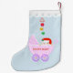 Personalizado lindo bebé de Santa sobre fondo azul claro Pequeños Navidades en caldo. Bebé en un cochecito rosa y bolas de Navidad con colores rojo, verde y dorado. El nombre de Santa Bebé puede ser personalizado.