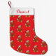 This holiday Christmas stocking is shown in red with a cute teddy bear print and a custom name at the top.