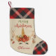 Calcetín navideño | Cara de unicornio con Antillas de Woodland y decorada con un spray de poinsettias sobre una manta roja de leñador. Texto personalizado. Todas las obras de arte originales © por WhimsicalArtwork™ Esto es parte de una mezcla y una colección navideña coordinada.