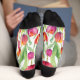 Un patrón repetido de tulipanes muestra una variedad de flores amarillas, naranjas y rosas con hojas verdes y exuberantes sobre un fondo blanco. Los colores vivos y los pétalos delicados contribuyen a crear una atmósfera alegre y de primavera