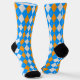 AZUL AQUÍ #0096FF y NARANJA TANGERINE #FF9300 Calcetines de patrón de arglos. UNISEX - Tamaño de Estados Unidos desde 5 a 11 hombres. Poliéster a partir de botellas de plástico recicladas e impreso con tintas a base de agua. 200 Zócalos de poliéster de nit de aguja: 58% poliéster reciclado, 22% de nylon, 15% de algodón y 5% de Elastano. La tienda "Argyle Socks". El hogar de calcetines de patrón Argyle - la idea de regalo perfecta para Navidades, un cumpleaños u otra celebración.