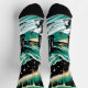 Escena nocturna encantadora con esquiadores deslizándose por una acogedora cabaña bajo la consoladora aurora boreal y un cielo estrellado.