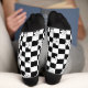 Cute and stylish black and white checkered socks with chessboard pattern and little flowers .