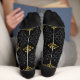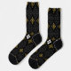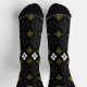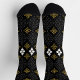 Black socks featuring a gold and white symmetrical geometric pattern are shown from top and side views, conveying a stylish and elegant tone.