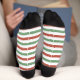 Un diseño navideño con rayas rojas y verdes sobre un fondo blanco y un árbol de Navidad colorido sobre la pantorrilla. Una prenda de vestir para la temporada de los Navidades o la noche cuando visitas a los suegros.