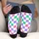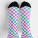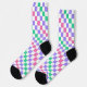 A vibrant checkerboard pattern featuring alternating pastel purple, pink, and green squares against a white background, creating a playful, colorful effect.