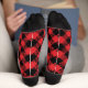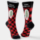 These socks feature a red and black checkered pattern with a Christmas tree on each side. On the top of each sock there is a black band with the words, "MERRY CHRISTMAS".